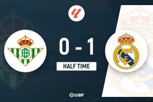 第17分钟,贝蒂斯门将开球被顶回,巴尔韦德得球远距离打出贴地箭被门将扑出,门前维尼修斯跟进补射入网!皇马1-0领先↓