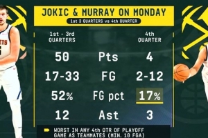 备注:约基奇和穆雷昨日末节合计12中2,命中率仅17%,两人作为队友以来季后赛末节最糟糕表现(最少10次出手)。