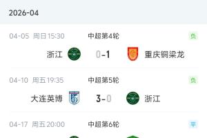 体育资讯04月25日讯 进入4月以来,浙江队连续5场中超比赛1平4负,且一球未进。