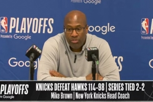 体育资讯4月26日讯 NBA季后赛首轮G4,尼克斯114-98轻取老鹰,大比分战成2-2平。赛后迈克·布朗接受了媒体采访,以下为采访全文。