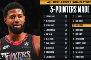 NBA官方发布统计,乔治季后赛三分数来到286记,超越费舍尔升至历史第13,距离12的科比只差6个。