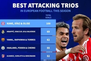 体育资讯4月29日讯 拜仁在本轮欧冠客场4-5不敌巴黎,三叉戟各进一球。数据统计显示,拜仁三叉戟本赛季各项赛事总进球数是五大联赛各队三人组最多。