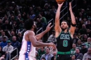 VJ追扰塔图姆的后门上篮,凯尔特人只得用杰伦对位恩比德:恩比德俩罚球拉开10分。