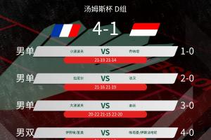 体育资讯04月29日讯 在北京时间今天凌晨进行的汤姆斯杯小组赛中,D组印尼1-4不敌法国小组出局,队史首次无缘淘汰赛。
