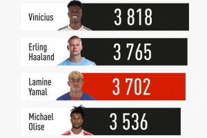 亚马尔本赛季出场3702分钟五大联赛前锋第三多,巴萨队内最多
