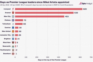 539天!塔帅上任以来,阿森纳在英超积分榜领跑天数仅次于利物浦