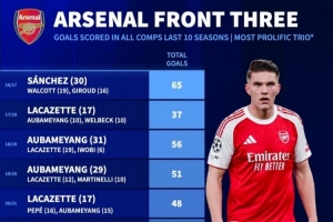 阿森纳近10赛季前场三人组进球榜:16-17赛季65球 本赛季38球